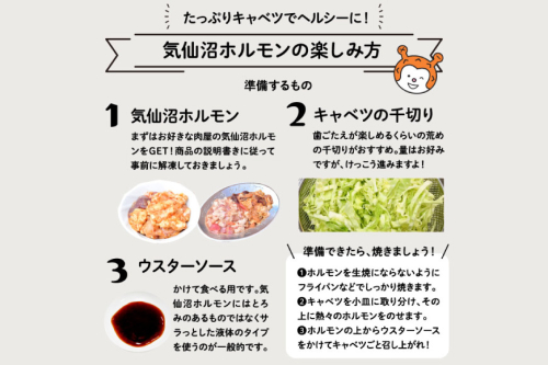 千切りキャベツにウスターソースをかけて、焼きあがったホルモンをキャベツに乗せて食べるのが気仙沼流です!
