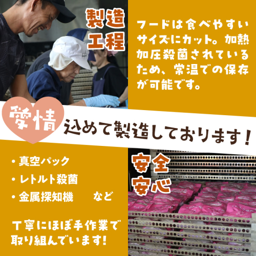 【説明】人用の国産鶏肉(胸肉)をボイルして香り高い桜木でスモークしてから、職人が手作業にてスライスし、真空パック→レトルト殺菌→金属探知機→お客様に発送になります。安全と安心愛情を込めて手作りした、100%素材そのままヒューマングレードになります。ワンちゃんには人間の約4倍以上のタンパク質が必要だと言われており、鶏肉には良質なタンパク質が多く含まれアミノ酸の量は牛肉・豚肉に比べより多く含まれております。桜の木でスモークすることで、香り高くわんちゃんの食欲アップすること間違いなし!!しっとりやわらかなモチモチ食感のスモークチキンに仕上げました。人間が食べられる食事同様の鮮度、品質で作った素材そのまま100%で安心・安全な無添加のフードになります。