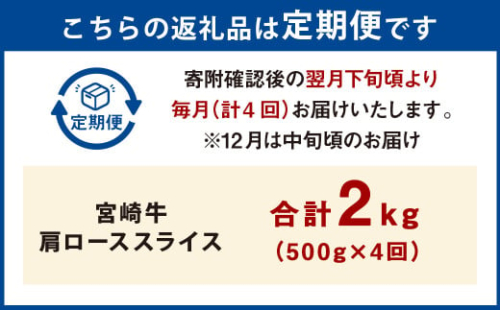 - 【4ヶ月定期便】<宮崎牛肩ローススライス 500g(1パック:500g×4回)> お申込みの翌月下旬頃に第一回目発送(12月は中旬頃) 牛肉 お肉 肉 和牛 新生活応援 卒業祝い 就職祝い 入学 卒業 お花見 引越し