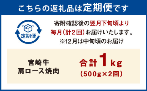 - 【2ヶ月定期便】<宮崎牛肩ロース焼肉 500g(1パック:500g×2回)> お申込みの翌月下旬頃に第一回目発送(12月は中旬頃) 牛肉 お肉 肉 和牛 新生活応援 卒業祝い 就職祝い 入学 卒業 お花見 引越し