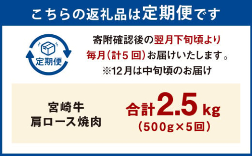 - 【5ヶ月定期便】<宮崎牛肩ロース焼肉 500g(1パック:500g×5回)> お申込みの翌月下旬頃に第一回目発送(12月は中旬頃) 牛肉 お肉 肉 和牛 新生活応援 卒業祝い 就職祝い 入学 卒業 お花見 引越し