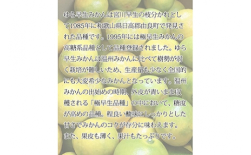 温州みかんの出始めの時期、外皮が青いまま収穫される「極早生品種」の中において、糖度が高めの品種。程良い酸味にしっかりとした甘さでみかんのコクが存分に味わえます。また、果皮も薄く、果汁もたっぷりです。