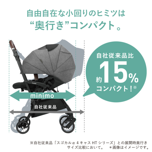※コンビ従来品「スゴカルα 4キャスHTシリーズ」との展開時奥行きサイズ比較において。