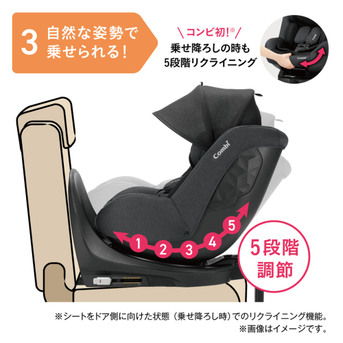 後ろ向きでも前向きでも、5段階リクライニング。赤ちゃんを快適な姿勢に保てます。