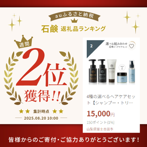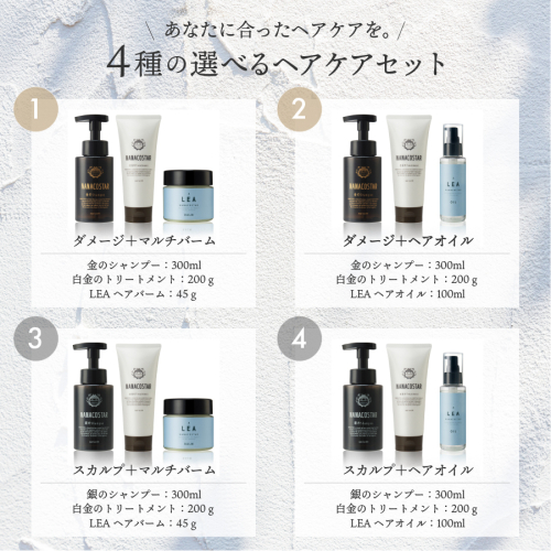 - 4種の選べるヘアケアセット【シャンプー・トリートメント+ヘアオイルorマルチバーム】