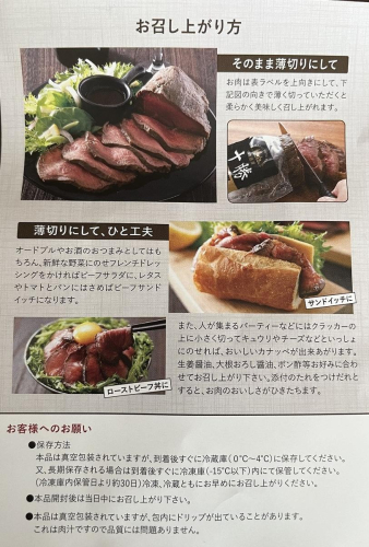 ローストビーフは冷蔵で届くので届いてすぐ食べられるので嬉しい味も最高においしい種類も豊富でどれも全部美味しいまた今年も頼みます