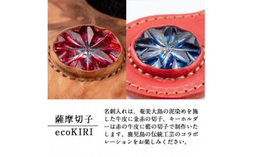 名刺入れは、牛皮の泥染、キーホルダーは牛皮での作成となり、切子の色は、金赤もしくは藍となります。伝統工芸のコラボレーションをお楽しみください。