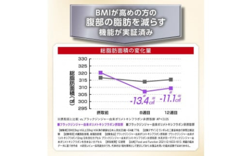日常活動時のエネルギー代謝において脂肪を消費しやすくする作用により、BMIが高め(BMI24以上30未満)の方の腹部の脂肪(内臓脂肪と皮下脂肪)を減らす機能があることが報告されています。(届出番号:I175)