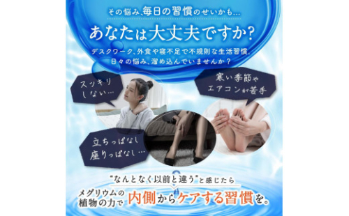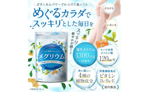メグリウムはたっぷりのカリウムと有容量のヒハツ、さらに4種類の植物成分でめぐり・すっきりを応援するサプリメントです。