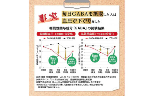本品にはGABAが含まれます。 GABAは、血圧が高めの方の血圧を低下させる機能があることが報告されています。(届出番号:H1290)