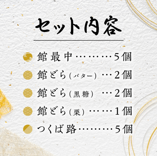 看板商品の館最中のほか、全国菓子博覧会で受賞歴のある人気の和菓子を3種15個を詰め合わせました。