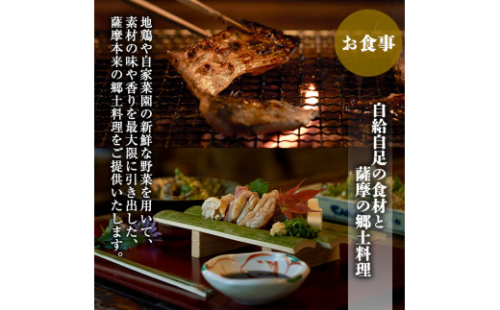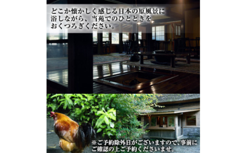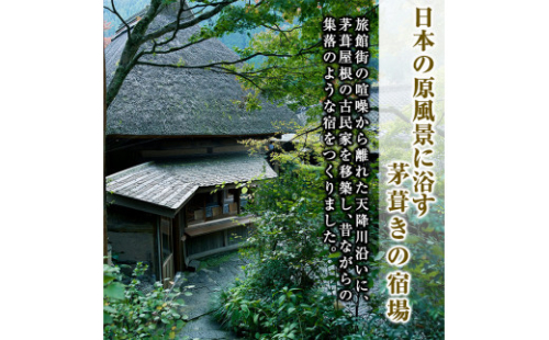 温泉付客室ペア宿泊券(1泊2食付)。妙見温泉。 茅葺屋根に囲炉裏の煙、庭に遊ぶニワトリたち。 天空の森で採れる旬の有機野菜や自前の鶏肉、卵を使ったすべて手作りの身体に優しいお料理です。 どうぞゆっくり、のんびりお過ごしください。 雅叙苑観光有限会社 0995-77-2114