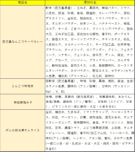 鹿児島県産黒豚のスパイシーな『なんこつキーマカレー』、鹿児島の伝統的なおかず味噌『豚みそ』、鹿児島黒豚軟骨と焼酎・黒糖をじっくりと煮込んだ『とんこつみそ煮』とポムの樹 冷凍オムライス『ポムオム』の詰合せセットでございます。