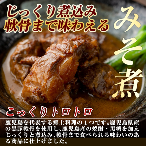 鹿児島県産黒豚のスパイシーな『なんこつキーマカレー』、鹿児島県産黒豚バラ肉を鹿児島の焼酎・黒糖を加えじっくりと煮込んだ『豚角煮』、鹿児島黒豚軟骨と焼酎・黒糖をじっくりと煮込んだ『とんこつみそ煮』とポムの樹 冷凍オムライス『ポムオム』の詰合せセットでございます。