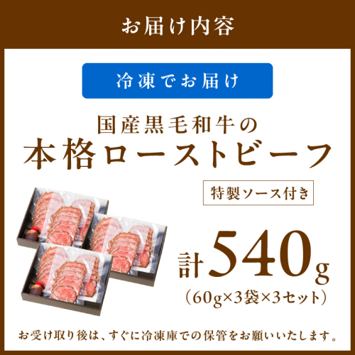 【クリスマスまでにお届け(12月20日~23日配送)】国産黒毛和牛の本格ローストビーフ(スライス済み) 60g×3袋×3 特製ソース付き