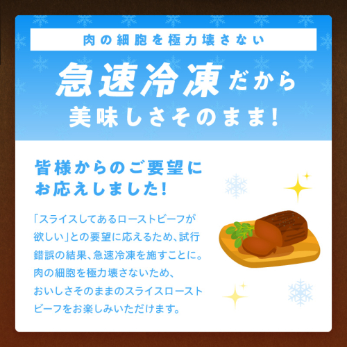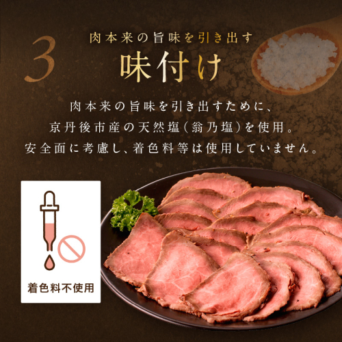 かねてより、お客様からスライスしてあるローストビーフが欲しいとの要望に応えるため、試行錯誤をくりかえし、肉の細胞を極力壊さないように急速冷凍を施し、やっと満足出来るスライスローストビーフが完成しました。京丹後市産の天然塩(翁乃塩)を使用し、肉本来の旨味を引き出すために着色料なども使用していません。