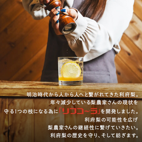 そのまま飲むも良し、お酒と割るもよし、利府梨の歴史と風味を感じながらリフレッシュしてください。整った体にリフコーラでお楽しみください。