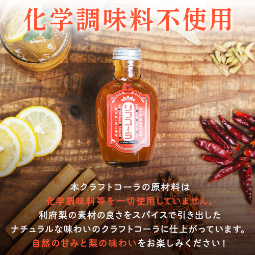 本クラフトコーラの原材料は長十郎梨、甜菜糖、シナモン、カルダモン、生姜、クローブ、ブラックペッパー、唐辛子と非常にシンプルであり、化学調味料等を一切使用していません。