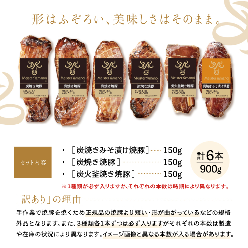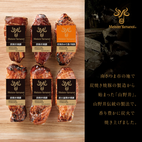 - 【訳あり ご自宅用】マイスター山野井 炭焼き焼豚 6本(3種)特別限定セット チャーシュー 焼き豚 オードブル 肉 豚肉 惣菜 おかず 家庭用 炭火 ラーメン お取り寄せ 詰め合わせ 詰合せ セット ご当地 食べ比べ 鹿児島 グルメ 冷蔵 南さつま市