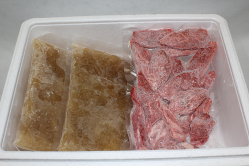 気仙沼産ふかひれ、(ヨシキリザメ)、スープ(醤油、食塩、調味料(オイスターソース他アミノ酸等)、ごま油) 黒毛和牛切り落とし(岩手県産国産和牛)