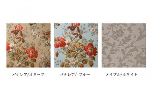 スツールのクッションは、豊かな色彩で花々を描いたパナレアオリーブ、パナレアブルー、クラシックスタイルによく用いられるアカンサス柄の地模様のメイプルホワイトの3カラーからお選びいただけます。