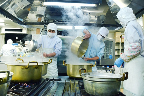 看板商品「金のさんま」を炊く工程も、お家にあるよりも少し大きな鍋でじっくりと炊き上げます。