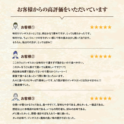 昭和41年創業以来、自家製の秘伝のタレで味付けしておりラム肉は、脂身やスジ、硬めのお肉をプロの目で一つ一つ確認し取り除いています。手作りならではの味わいをお召し上がりください。