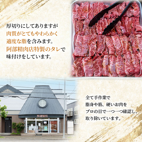 牛の横隔膜の部分で、厚切りにしてありますが肉質がとてもやわらかく適度な脂を含みます。当店特製のタレで味付けしております。