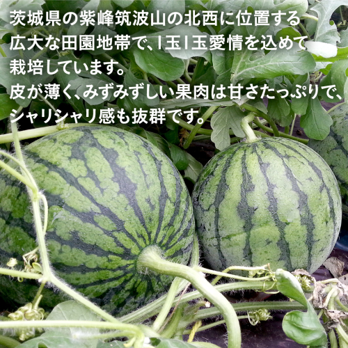 JA北つくばこだま西瓜部会は、第48回日本農業賞(集団組織の部)特別賞を受賞しており、高い評価を獲得しています。 茨城県の紫峰筑波山の北西に位置する広大な田園地帯で、1玉1玉愛情を込めて栽培しています。 皮が薄く、みずみずしい果肉は甘さたっぷりで、シャリシャリ感も抜群です。 初夏の味わいこだますいか、ぜひご賞味下さい。 【注意事項】 商品は配送の都合上、ビニール袋に入っております。到着後すぐに箱から取り出し、ビニール袋を外して直射日光の当たらない涼しい場所で保管下さい。すいかは鮮度が命です。到着後、早めにお召し上がり下さい。 冷蔵庫で1~2時間程度冷やして食べるのがオススメです。 ※お受け取り後は、すぐに状態をご確認ください。※ 万全を期して返礼品をお届けしていますが、万が一、不備等があった場合は返礼品受け取り時に、写真(画像)を添付のうえ電子メールにてご連絡ください。 日数が経ったものに関しましては対応いたしかねますので、ご了承ください。 また、不備等があった返礼品は食べたり、飲んだり、捨てたりせず、対応が決まるまで保管をお願いします。保管されてない場合、代替品での対応等が難しい場合がございます。 ご連絡先:sakuragawa@furusato-g.com 【保存方法】 高温・多湿・直射日光を避け、涼しい場所で保管して下さい。 【事業者】 JA北つくばファーマーズマーケット 地場産品類型:1 類型該当理由:市内で生産されたもの