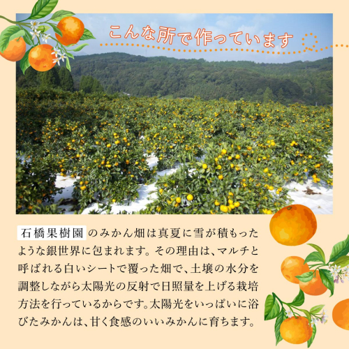 白いシート(マルチ)で畑を覆って土壌の水分量を調整し、太陽光の反射で日照量を増やすことで甘く食感の良いみかんが育ちます。