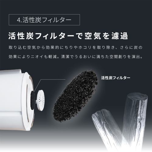 取り込む空気から効果的にほこりや塵を取り除きます。さらに炭の効果によりニオイも軽減。清潔でうるおいに満ちた空間づくりを演出します。
