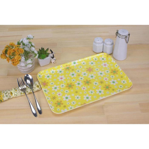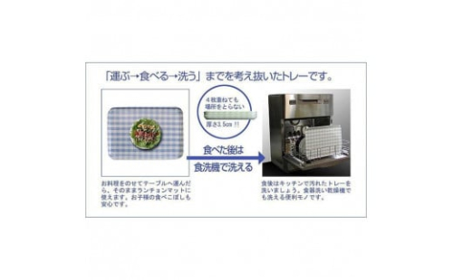 おしゃれ心いっぱいのテキスタイル(布地)の風合いをそのままに、お盆の産地で知られる、紀州漆器の技術で作られた三役こなす便利なトレーです。花畑をイメージさせるお花いっぱいのトレーは、毎日の食卓を華やかに彩ってくれます。持ち手部分を小さくして隅々まで使えるようにデザインされたスクエアフォルム。こちらのトレーは電子レンジ対応なので、トレーに食器をのせたままレンジに入れて「チン!」することができます。3分以内の加熱ならトレーは手で持てる範囲の温度です。加熱後は、熱い食器に触れることなくトレーごと取り出せます。お料理をのせてテーブルへ運んだ後は、そのままランチョンマットにもなってくれる優れもの。お子様の食べこぼしも受け止め、テーブルを汚れから防いでくれます。食品衛生法にも合致した樹脂を使用していますので、お子様にも安心してご利用頂けます。布製のランチョンマットとは違い、食べこぼしは食後にさっと水洗いができるのはもちろん事、家庭用食洗機でも洗浄頂けるので便利です。