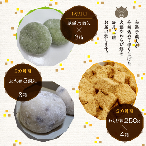 職人が丁寧に作り上げた大福やわらび餅を毎月1回お届け致します。3カ月の3回となります。