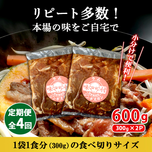 【定期便:全4回】 味付きジンギスカン 300g×2個 オンライン 申請 ふるさと納税 北海道 恵庭 ラム肉 ラム 味付き タレ 羊 羊肉 肉 お肉 ジンギスカン 焼肉 バーベキュー BBQ アウトドア 定期便 4ヶ月 恵庭市