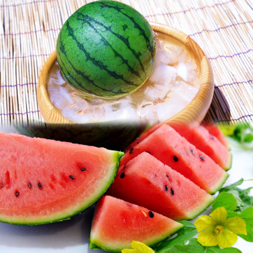 『小玉すいか』大玉よりも小ぶりで皮が薄いので、皮のぎりぎりまで甘さとみずみずしさをお楽しみいただけるすいかです。