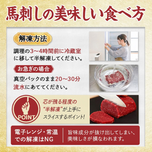 ★馬刺しブロック各種は真空パックでお届けします。お召し上がり前にチルド室等で「半解凍」状態にしてから包丁を入れると綺麗に切ることが出来ます。