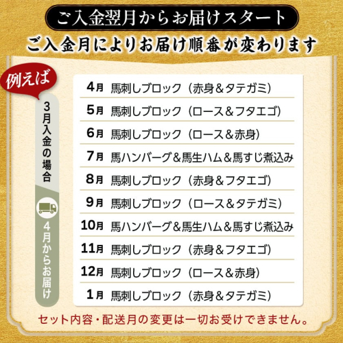 『馬刺し』用のブロック肉4種を主軸に、「馬肉入りハンバーグ」「馬すじ煮込み」「馬生ハム」等、バラエティに富んだ内容を毎月1回、合計10ヵ月お届けする『馬尽くし』の定期便です!