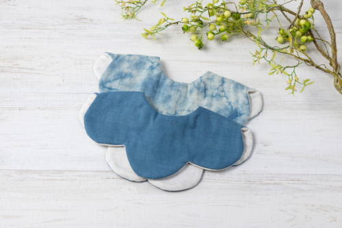 こちらはハンドメイド品になります。魚津市鹿熊で天然藍染め(むら藍染め・淡藍染め)されたダブルガーゼをそれぞれ表面に、裏面は生成り色ダブルガーゼを使用したスタイ2枚セットです。