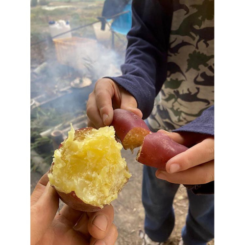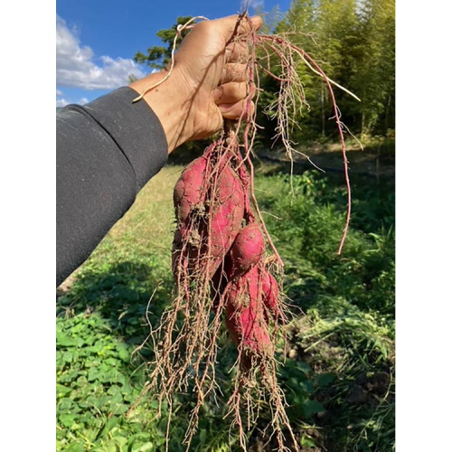 畑に入れるのは草や落ち葉のみで、森の自然の循環をお手本にしています。株ごと収穫するため、大きさにはばらつきがありますが、小ぶりなサイズは魚焼きコンロで焼き芋を楽しむのにぴったり。料理に合わせてお使いいただけると嬉しいです。
