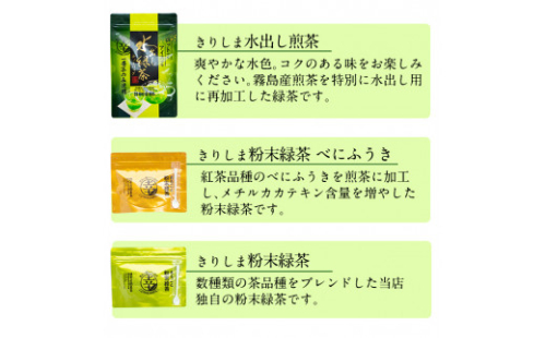 特上煎茶(100g)1本・上煎茶(100g)1本・普通煎茶(100g)2本・水出し煎茶(75g)3本・べにふうき粉末(40g)1本・粉末緑茶(40g)2袋