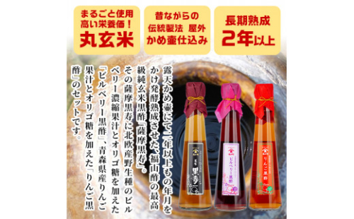 二年間醸造熟成させた最高級玄米黒酢【黒寿】りんご果汁とオリゴ糖を加えたりんご黒酢・アントシアニン豊富な北欧産ビルベリーとオリゴ糖を加えたビルベリー黒酢のセットです。