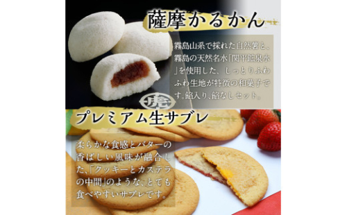 西郷隆盛公が名付けた角まんじゅう、鹿児島銘菓かるかん、霧島産のみかん/九州産のいちごを使用したプレミアム生サブレなどを詰合せたセットです。