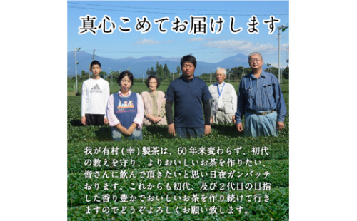 自家農場、自家工場で全てを我が家で手掛け癒しのひと時を過ごして貰う為に丹精込めて作り上げた6種類の霧島茶を色々な場面に合わせてお楽しみください。 有村(幸)製茶 0995-58-4159 【消費期限】 約1年