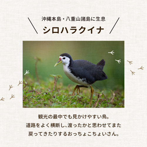 絵柄のシロハラクイナは、沖縄本島・八重山諸島に生息する鳥。空高く飛ぶことはできず、低空飛行します。道路をよく横断し、渡ったかと思わせてまた戻ってきたりするので、自動車の運転時には注意が必要です。ちょこちょこ歩く姿がなんとも愛らしく、観光の最中でも見かけやすい鳥です。