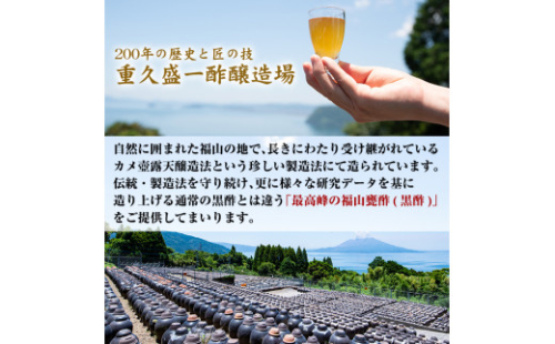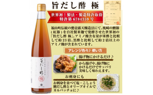 福山町伝統の甕壺露天醸造法(かめつぼろてんじょうぞうほう)にて、枕崎の鰹節(紅節)を自社製米麹で発酵させた世界初(製法・製造特許:特許第6784359号)の「旨だし酢 極」は、アミノ酸が黒酢の約2倍含まれています。