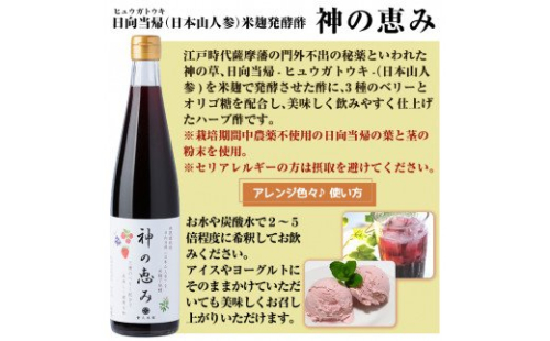 ・神の恵み:醸造酢(日向当帰酢、米黒酢)(鹿児島県製造)、イソマルトオリゴ糖、ニゲロオリゴ糖、加工黒糖、いちご濃縮果汁、ラズベリー濃縮果汁、ブルーベリー濃縮果汁※セリアレルギーの方は摂取を避けてください。