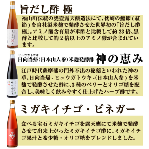 - D0-075 贅沢なプレミアムセレクト6本セット (旨だし酢極、神の恵み、一年熟成玄米黒酢酸度5%、発芽玄米黒酢酸度4.2%、ミガキイチゴ・ビネガー、リンゴ黒酢)【重久盛一酢醸造場】霧島市 重久本舗 フルーツ黒酢 黒酢 酢 お酢 ドリンク
