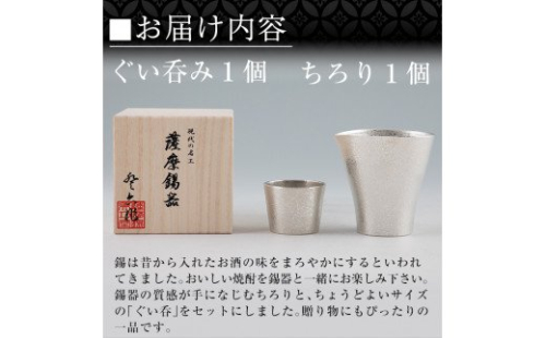 《100年以上の老舗店・薩摩錫器工芸館》 鹿児島に根付く”焼酎文化”を鹿児島県の伝統工芸品に認定されている「薩摩錫器」と一緒にいかがでしょうか。 錫は昔から入れたお酒の味をまろやかにするといわれてきました。おいしい焼酎を錫器と一緒にお楽しみ下さい。 錫器の質感が手になじむちろりと、ちょうどよいサイズの「ぐい呑」をセットにしました。贈り物にもぴったりの一品です。 【薩摩錫器とは】 鹿児島県霧島市を代表する伝統工芸品です。 300年の歴史を持つ薩摩藩ゆかりの錫細工です。 錫器は使うほどに味わいが出て手にするとずっしりと重みと温かさがあります。 また、イオン効果があり、焼酎の味がまろやかになるといわれています。 薩摩錫器工芸館 株式会社 0995-45-0177 https://www.satsumasuzuki.co.jp/ 《地産理由》市内で製造・加工された工芸品