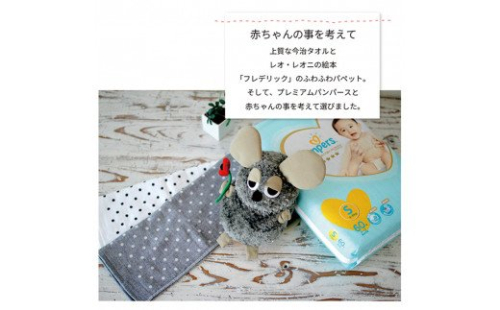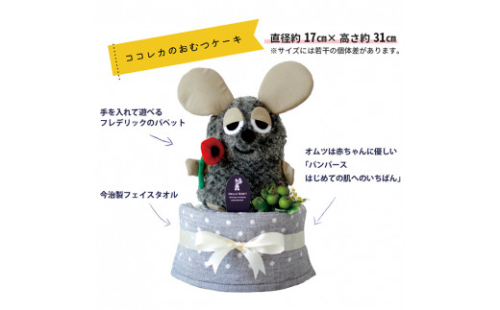 鹿児島県霧島市にある出産祝いの専門店「ココレカ」。 オムツケーキやはじめてのギフトセット等、ひとつひとつ丁寧に手づくり作業をしています。 全国の赤ちゃん、ママさん、パパさんへ「お祝いの気持ち」をお届けいたします。 「スイミー」のお話で有名なイタリアの絵本作家レオ・レオニの絵本「フレデリック~ちょっとかわったねずみのはなし~」の 主人公フレデリックのハンドパペットと今治タオルを使って作ったおむつケーキです。 株式会社無垢 0995-56-8615 《地産理由》市内で製造した製品