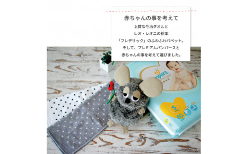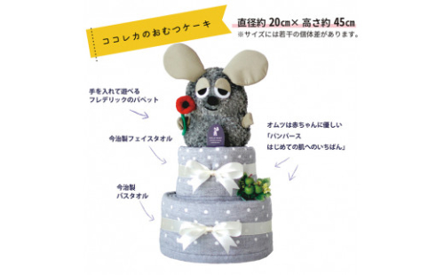 鹿児島県霧島市にある出産祝いの専門店「ココレカ」。 オムツケーキやはじめてのギフトセット等、ひとつひとつ丁寧に手づくり作業をしています。 全国の赤ちゃん、ママさん、パパさんへ「お祝いの気持ち」をお届けいたします。 「スイミー」のお話で有名なイタリアの絵本作家レオ・レオニの絵本「フレデリック~ちょっとかわったねずみのはなし~」の 主人公フレデリックのハンドパペットと今治タオルを使って作ったおむつケーキです。 株式会社無垢 0995-56-8615 《地産理由》市内で製造した製品
